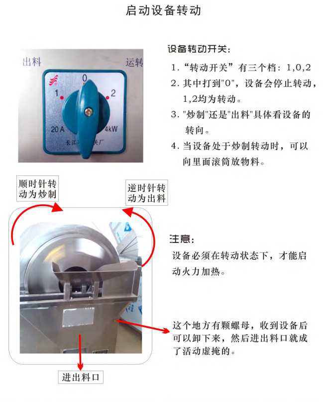 客户在炒制过程中遇到停电的情况,为了避免物料浪费。应先将筒内物料放出来。待电力恢复正常后再将物料重新倒回滚筒内进行炒制。