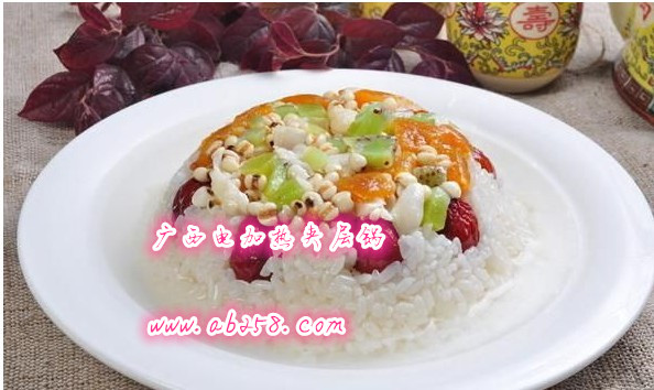 甜莲八宝饭是广西风味-的传统名点之一,南宁的饮食店便有八宝饭应市。40年代中期,座落于南宁闹市区的万国酒家推出的甜莲八宝饭,被誉为八宝饭中一支花。主要制作方法:先将浸泡透的-糯米蒸熟,并趁热淋上奶油、蜂蜜、拌匀;接着将莲子、青梅糖、葡萄干、桂圆肉、杏仁、榄仁、核桃仁、蜜枣等干果、蜜饯放在碗底,拼成各种花纹图案;再把一些干果、蜜饯放入糯米饭中拌匀,放入碗中压紧,入笼蒸熟。吃时将其倒扣在瓷碟上,浇上玫瑰色糖液。其特色图案清晰精美,色彩缤纷,鲜艳夺目,香干兰,甜如蜜,软如脂,白如玉,亮如珠,不论其外观、色道和气味,均吸引人。