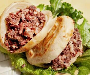 驴肉火烧为一种面食,一般为死面做成(注:死面为未经发酵的面粉,经过发酵的面粉叫做活面,用活面做成的类似东西称为“烧饼”),将其在饼铛里烙熟后,架在灶头里烘烤,使其外焦里嫩,别具风味;趁热用刀劈开,加入热腾腾的熟驴肉,是→正宗的吃法。另有肉汤加淀粉熬制的焖子夹入火烧佐食,其中以保定南部定州地区的焖子→为美味和。