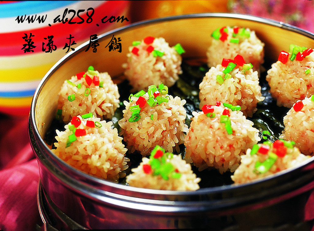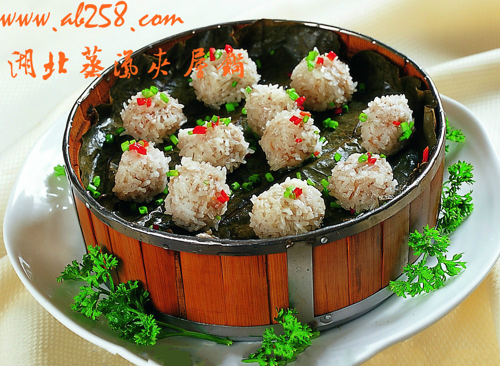 珍珠圆子是湖北沔阳(今仙桃市)的汉族小吃,系的“沔阳三蒸”之一。沔阳珍珠圆子是以猪瘦肉、肥肉做成的圆子,再滚以糯米蒸制而成,圆子蒸熟后,外面粘的整粒糯米发光油亮,形似珍珠,因而得名。沔阳蒸菜大都作为筵席中的大菜上席,故江汉平原素有“不上格子(指蒸笼格)不清客”的习俗。此菜多以小蒸笼上席,传统的蒸笼一般直径17厘米左右,小巧精制,俗称“垛笼”。