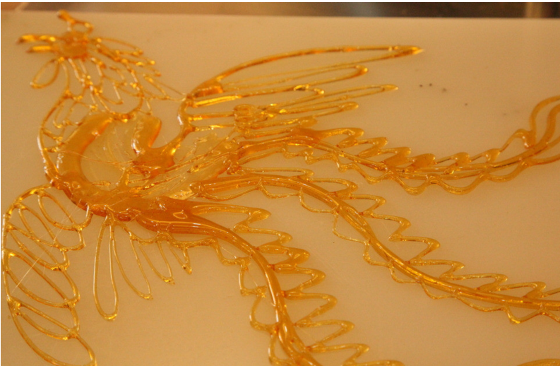 糖画,一勺一铲,等糖熬到可以牵丝时,用小汤勺舀起溶化了的糖汁,在石板上飞快地来回浇铸,完成后,用小铲刀将糖画铲起,粘上竹签。