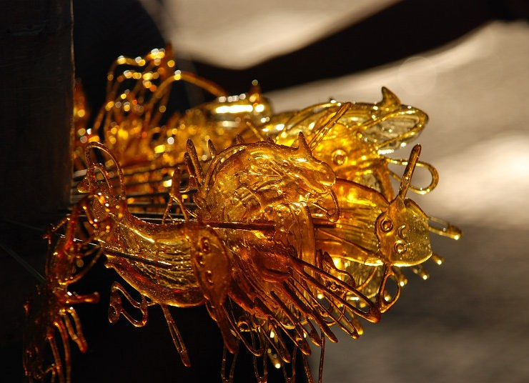 小时候,街头经常有卖糖画的,画糖画的都是一个个小小的摊档,工具非常简单,小煤炉上烧着焦香的糖,一个木柜子上面展开两扇桌面,一边是幸运转盘,画着一圈图案,顾客付钱即能转一次转针,指到的图案就是糖画的图案了.每个人都希望能转到复杂、漂亮的图案,比如龙、凤么的,可惜幸运的人很少。于是就连无心购买的人也热心地围观,在如今的社会,它已经成为了一种街头艺术