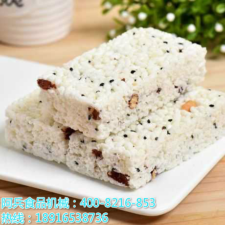 熬糖过后,将物料放到搅拌机中搅拌,我们的搅拌机内置四氟乙烯板以及具有自动控温系统,物料热了以后,将糖浆倒入搅拌机内混匀,然后直接送入成型切块机内,香喷喷的米花糖就出炉了!