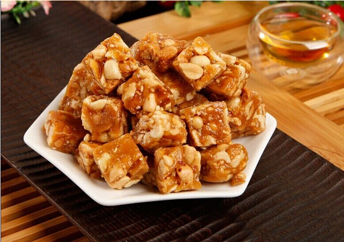 麦芽糖、猪粽头肉等,口味酥脆,工艺是炒、熬、煮。