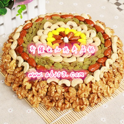 切糕是玛仁糖在新疆外地区民众在不知道名称的情况下根据贩卖时的特点所赋予的名称,是一种新疆维吾尔民众采用传统特色工艺,选用核桃仁,玉米饴、葡萄干、葡萄汁、芝麻、玫瑰花、巴丹杏、枣等原料熬制而成的民族特色食品。