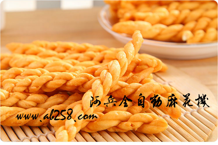 该机是我公司技术人员根据市场需要历时三年设计制造的无油分麻花专科生产设备,该机采用综合自动化控制技术,能生产长短、粗细不同的各种产品,产品成型整齐均匀,产量高,能耗低,有效的节省了人力,一人操作,容易操控。→大优点可以与手工制作的麻花口感一样,酥脆香甜。