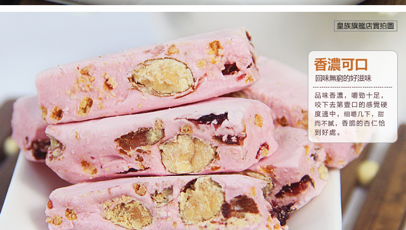 牛轧糖又称蛋白糖,是用蛋白、糖浆、果仁等经充气加工制成的半软性糖果,剖面可见较多的细孔,结构疏松,组织细致。