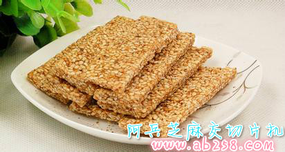 芝麻片为传统小食品之一,历史悠久。成品为小方块,色泽乳白,质地细密,松脆爽口、甜香宜人。其